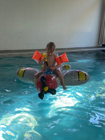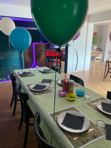 Na de 2 uur durende waterpret voorzien we één uur op de mezzanine in het droge gedeelte en de speelruimte. Hier staat een pooltafel en is wat speelgoed voorzien, maar naast de keuze tussen pannenkoeken, hot-dogs of fish-stick-burgers is er ook tijd voorzien om de cadeautjes uit te pakken....